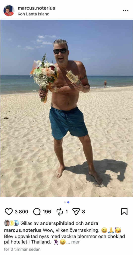 ”Wow, vilken överraskning. Blev uppvaktad nyss med vackra blommor och choklad på hotellet i Thailand. Från kollegorna på Nyhetsmorgon. Så roligt. Tack!!!”, skriver Marcus till inlägget.